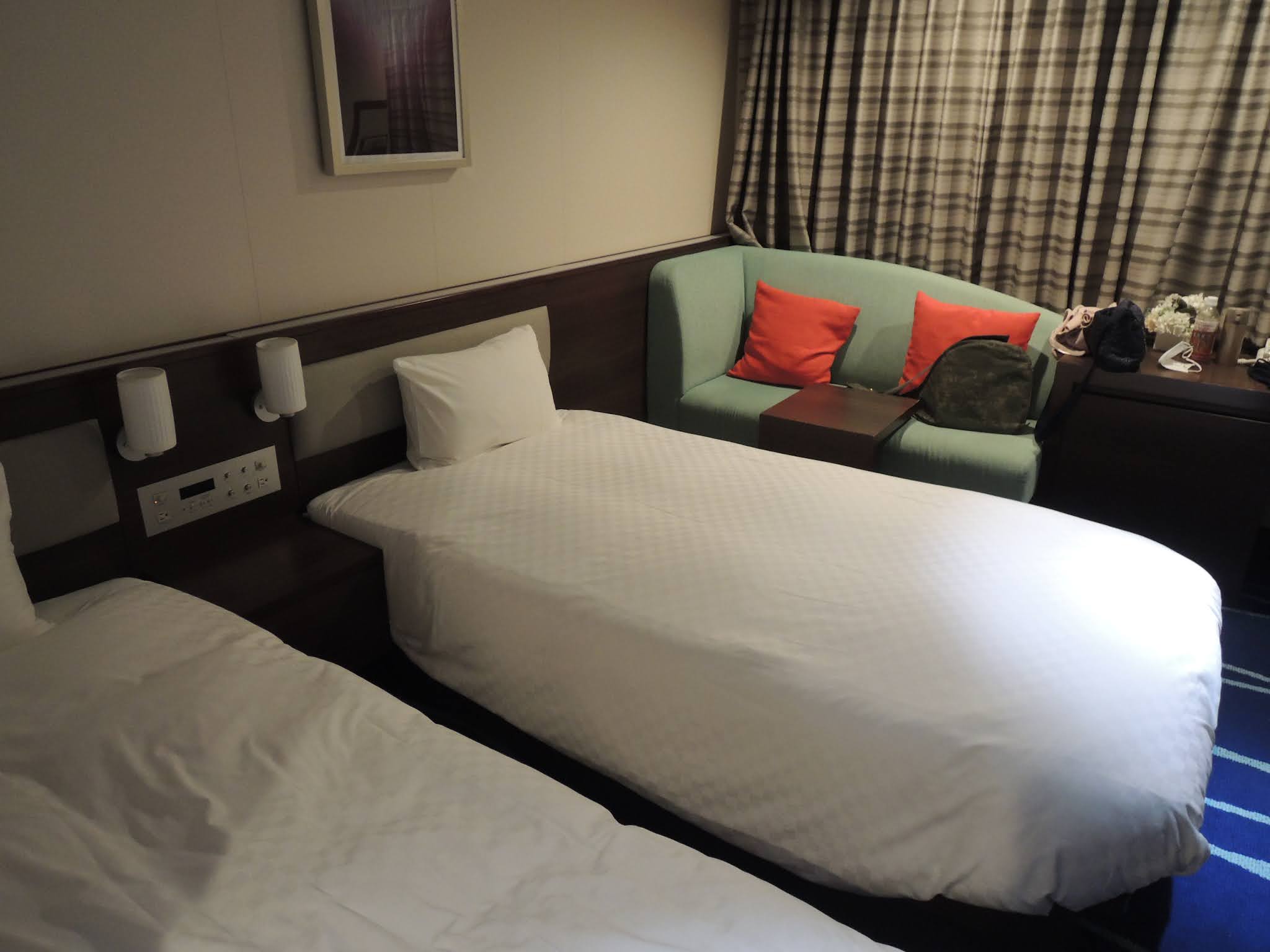 検温が必要で証明書をもらわなくてはいけませんでした。フェリーは個室を予約しておきました。割引を使えば以外にお得です。夕飯です。茶色い物オンパレードです。